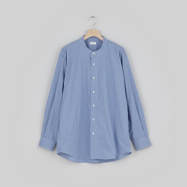 超超長繊維・スビンコットンの80番手単糸という細い糸を、限界まで高密度で織ったタイプライター生地のバンドカラーシャツ。エレガントなハリとコシ、スビンコットンならではの滑らかな質感が特徴です。デザインのモチーフは、ドレスとワークのディテールが入り混じる1960年代のアメリカの古着。細い糸、細かい運針によるドレスシャツのような繊細な縫製と、岡山特有の巻き縫いミシンによるワークウェアのようなカジュアルさが同居しています。2024春夏モデルは、首周りにゆとりをもたせるなど、これまで展開していたものよりも大きめのサイジング。また、ユニセックス展開となり、いっそう豊富なバリエーションから、気分に合わせてサイズを選べます。